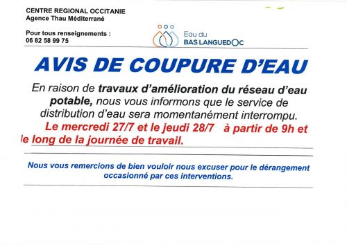 Avis coupure d’eau – mercredi 27 et jeudi 28 juillet – dès 9h pour la journée / secteur Av Maupas