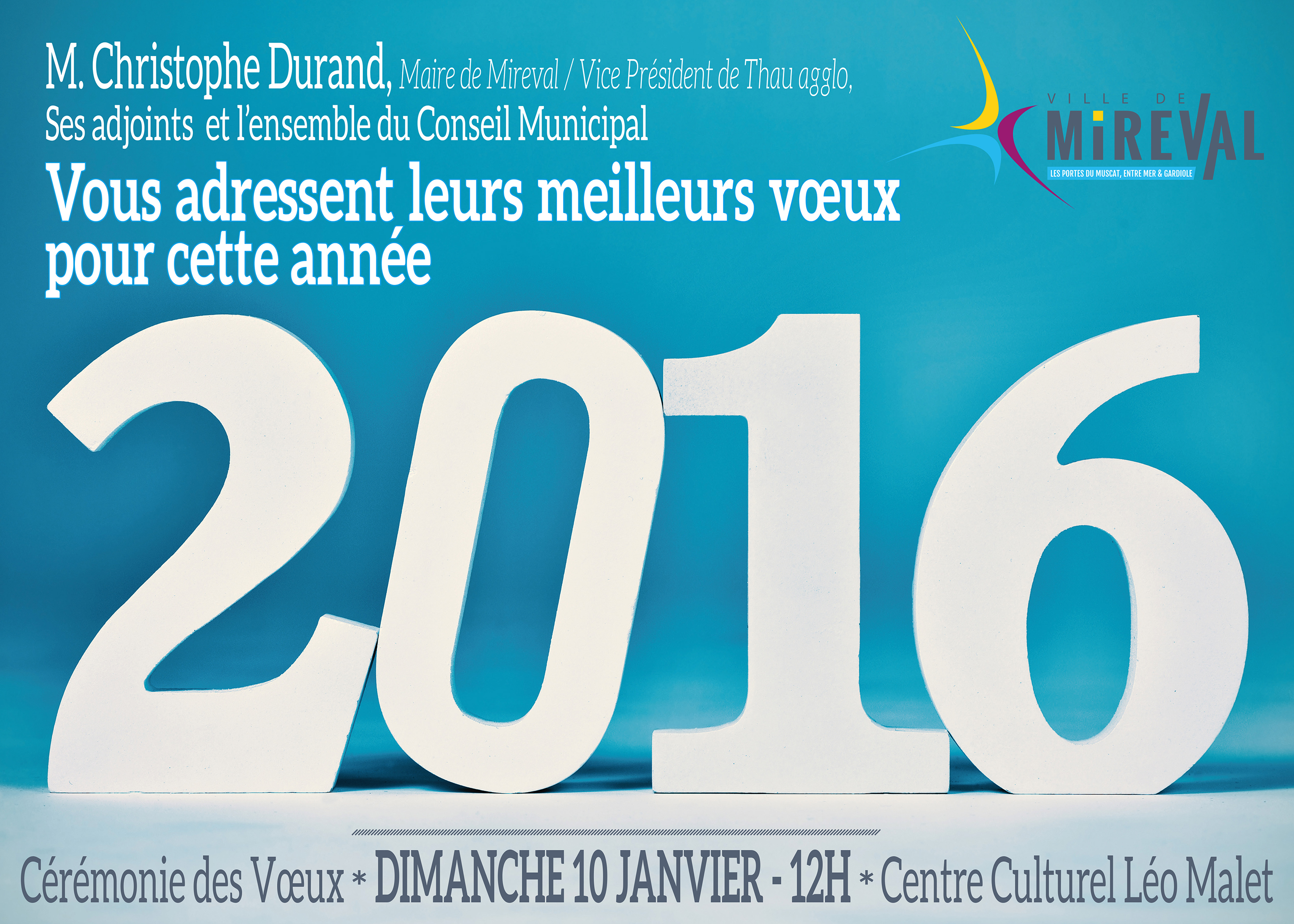 Christophe Durand, maire de Mireval et vice-président de Thau Agglo, ses adjoints et l’ensemble du conseil municipal, vous invitent à la cérémonie des vœux 2016 organisée ce dimanche 10 décembre, à 12h, au Centre Culturel Léo Malet !