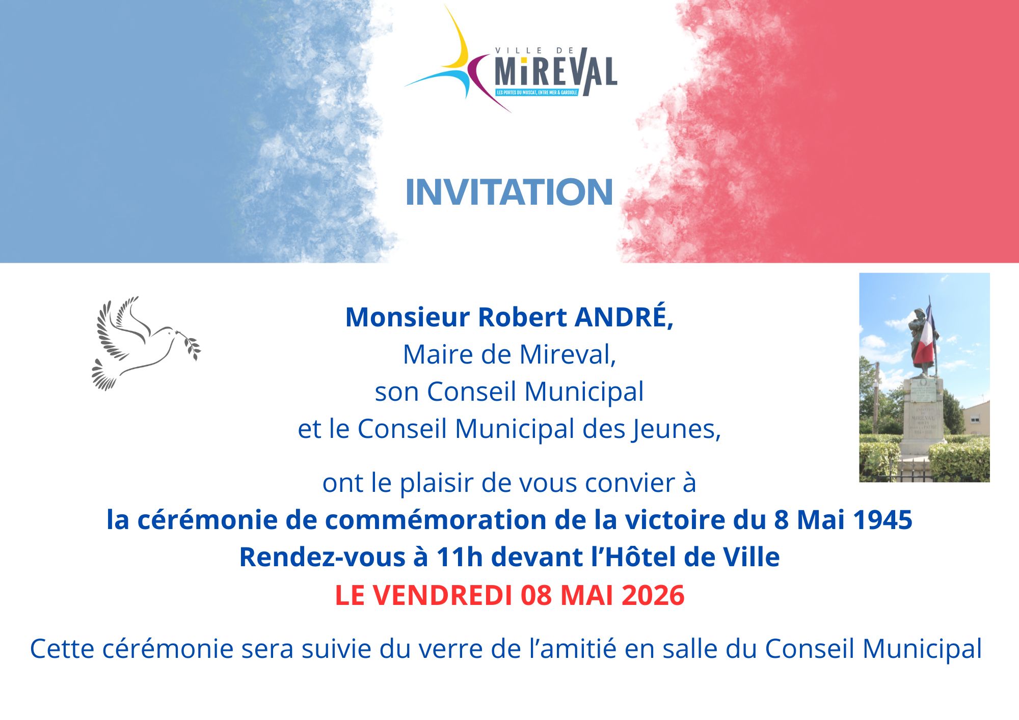 Monsieur Robert André, Maire de Mireval, le Conseil Municipal et le Conseil Municipal des Jeunes ont le plaisir de vous convier à la cérémonie officielle en hommage à ces héros.