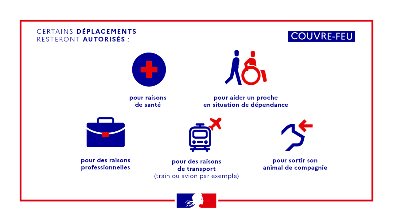 Dès ce soir après minuit, aucune activité ne sera possible entre 21h et 6h du matin, sauf exceptions sur présentation d’une attestation (téléchargeable ici).
