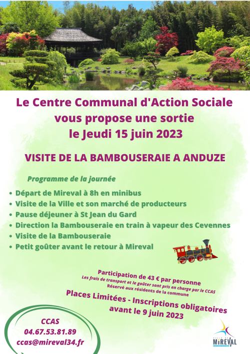 Le Centre Communal d’Action Sociale vous propose une sortie le 15 juin 2023. Départ de Mireval à 8h en minibus, direction Anduze. Après une visite de la ville et et de son marché, vous ferez une pause déjeuner à St Jean du Gard. Puis, direction la bambouseraie en train à vapeur des Cévennes ! Visite de la bambouseraie et gouter, puis retour à Mireval. Participation de 43€ par personne. Places limitées, inscriptions obligatoires avant le 9 juin au 0467538189 ou ccas@mireval34.fr