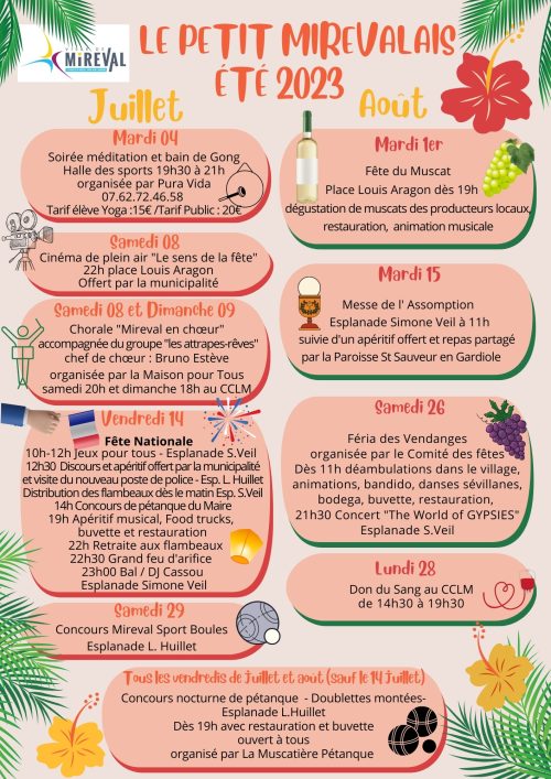Tous vos rendez-vous Mirevalais festifs, sportifs, culturels, associatifs sont indiqués dans le Petit Mirevalais. Celui-ci regroupe les évènements prévus pour les mois de juillet et d’août.