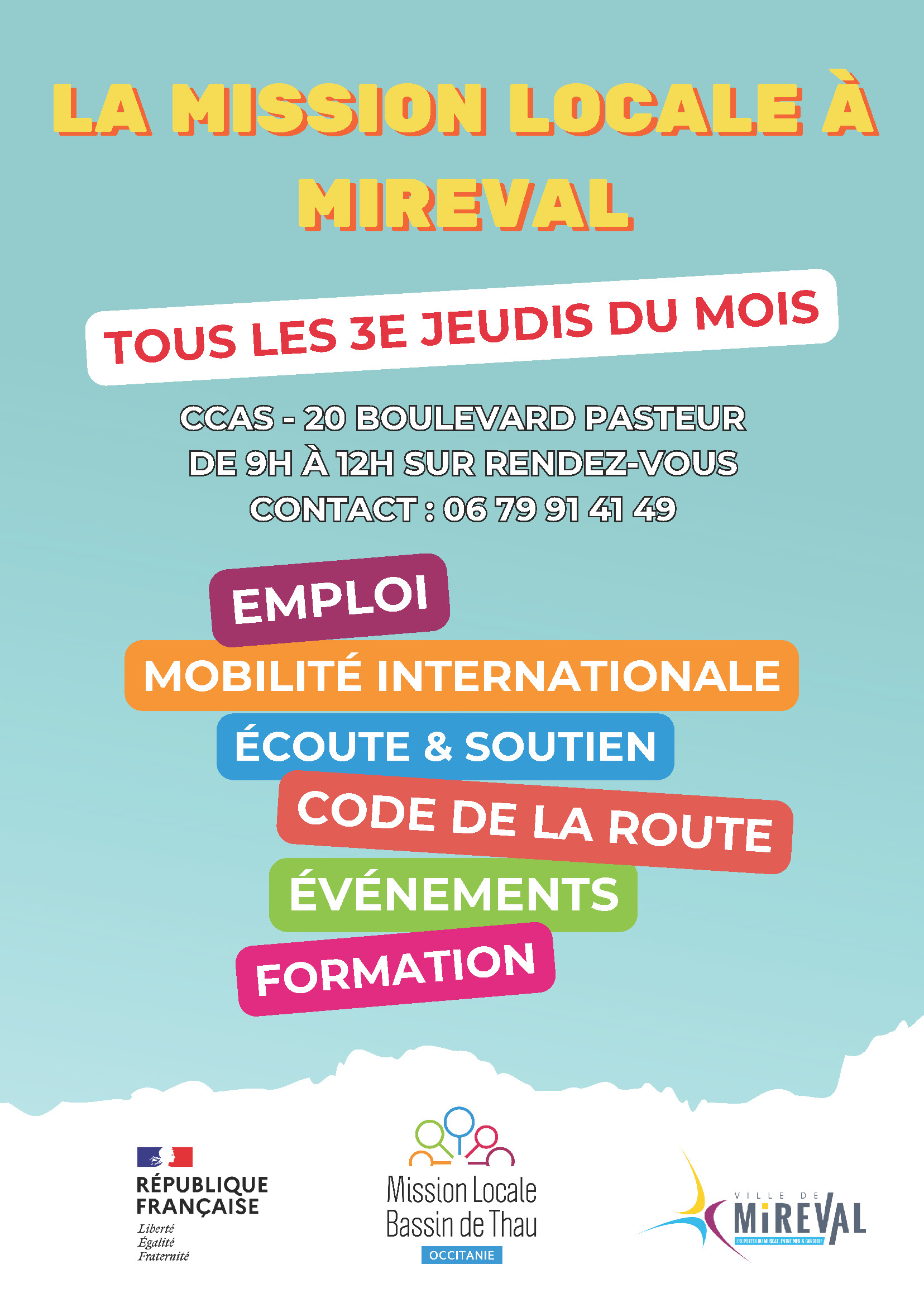 Permanence assurée par la missions locale à Mireval tous les 3ème jeudi de chaque mois, de 9h à 12h sur rendez-vous au 06 79 91 41 49