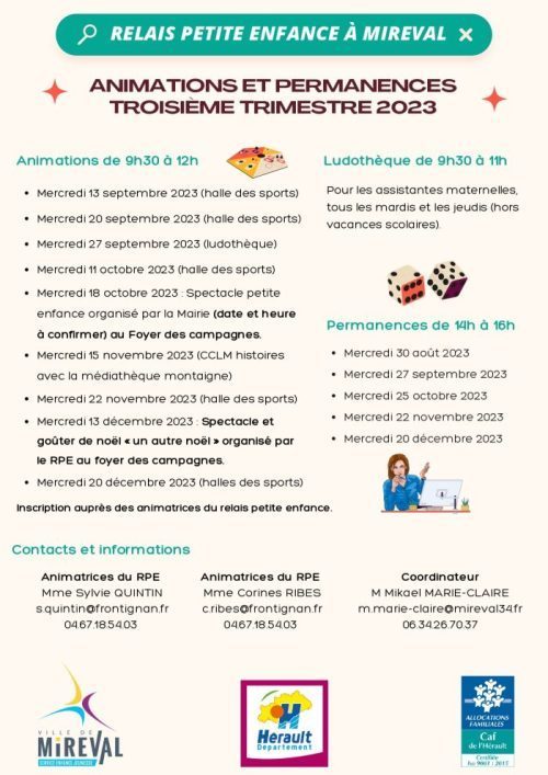 Voici les permanences et animations prévues pour le Relais Petite Enfance de Mireval du troisième trimestre 2023 !