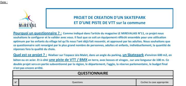 Un projet longuement réfléchi pour la Ville, un skatepark et une piste de VTT/BMX et nous aimerions le configurer et le valider avec vous, pour cela, veuillez remplir le formulaire ci-dessous et le remettre au secrétariat de la Mairie le 15 février au plus tard.