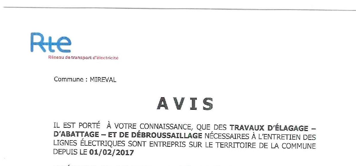 Il est porté à votre connaissance, que des travaux d’élagage, d’abattage et de débroussaillage nécessaires à l’entretien des lignes électriques sont entrepris sur le territoire de la commune depuis le 01 Février 2017.